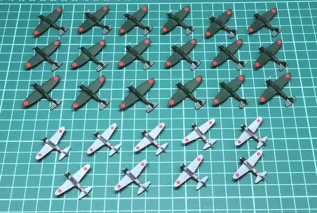 零式艦上戦闘機21型も含めて、27機の攻撃隊。明灰白色と暗緑色のコントラストも美しく、見ごたえのある仕上がりです。