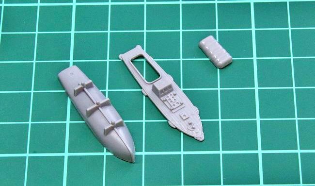 内火艇用のパーツは、デッキ、キャビンに加えて上部構造物の小物、マスト、キャンパスフレーム、旗竿、錨、ハッチなどを使用しました。特にキャビンとキャンパスフレームは、ディテールアップ効果が高いポイントです。