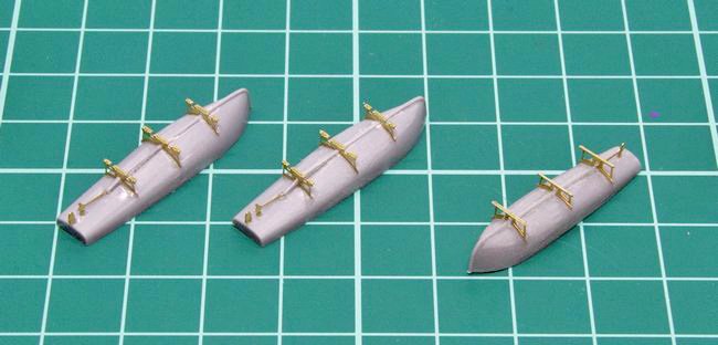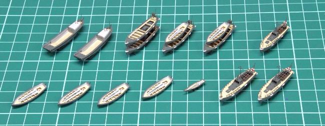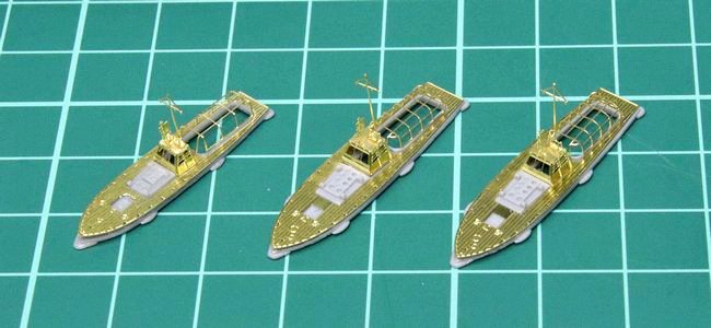 組み立てと塗装を終えた、11m内火艇と12m内火艇×2隻。スクリューは、例によって未塗装の真鍮地のまま取り付けました。
