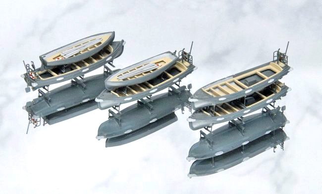 12m内火ランチと9mカッターの二段積み×3セット。カッターの腰掛はシップヤードワークスのエッチングで、ディテールの奥行き感を演出してくれました。