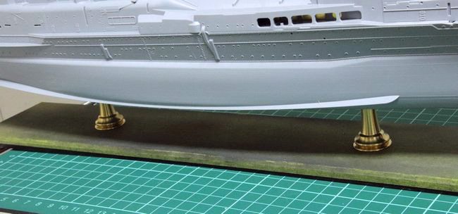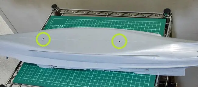 前回までに船体左右の接着は完了したので、今回は、まず飾り脚の取り付け穴の開口からはじめました。大戦期の戦艦や正規空母サイズ感の場合、個人的には200mm程度が見栄えが良いと思います。