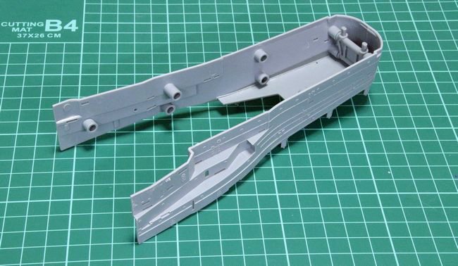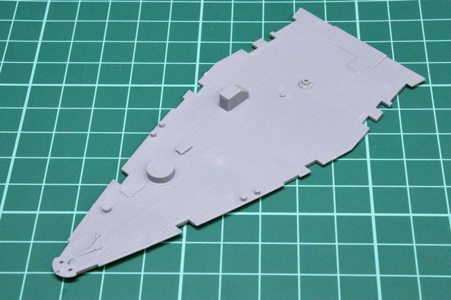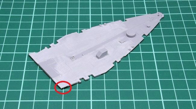 続いては艦尾の艦載艇デッキの下処理に進みます。写真では分かりづらいですが、ここにはリノリウムの押さえ金具のモールドが入っていますので(のちのエッチング化に備えて)モールドを削り落としました。