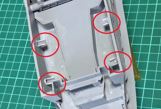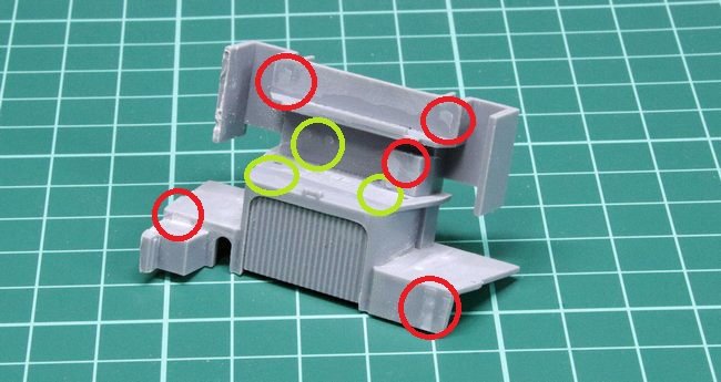 これは、格納庫後端部のキットパーツを組み立てた様子。赤丸部分は水密扉などのモールドを(エッチング化に備えて)削り落とした部分で、緑丸で示した部分は、逆に(ホーサーリールなどの)取り付け穴を埋めた箇所です。