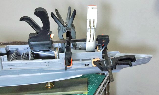 艦尾付近は、少し強めに抑え込む方が正確に組み上がるので、クランプやピンチなどを総動員して半日ほどかけて圧着しました。