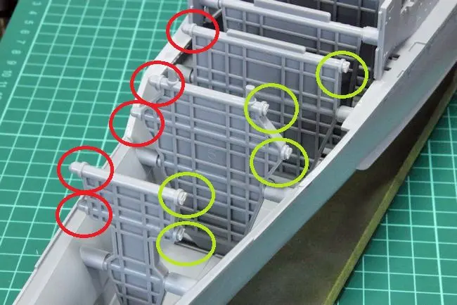 艦載艇収納庫上部のフレームは、艦載艇の取り付け時に邪魔になるため、船体内側の取り付けブラケットの上部を切り欠いて、後付けできるように加工しました。