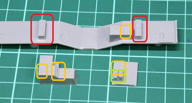 ここはエッチング化に備えたモールド切削の多い箇所です。赤い四角で囲った箇所はトラス支柱で、他に黄色の水密扉、緑色のラッタルなども全て削り取りました。