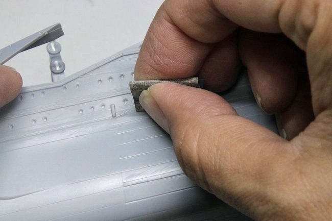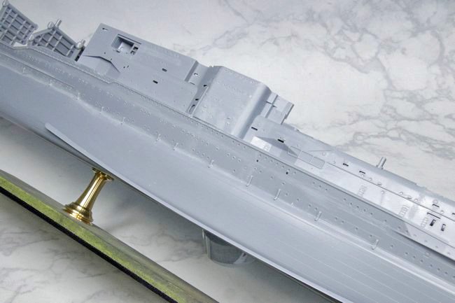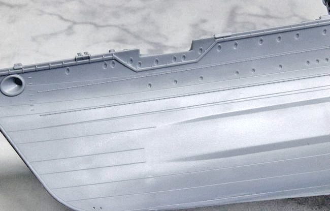 続いて、船体に施されたモールドも切削していきます。アップにするとよくわかるのですが、船体側面には無数のジャッキステーとモンキーラッタルのモールドがありますので、これらも全て削り落としました。