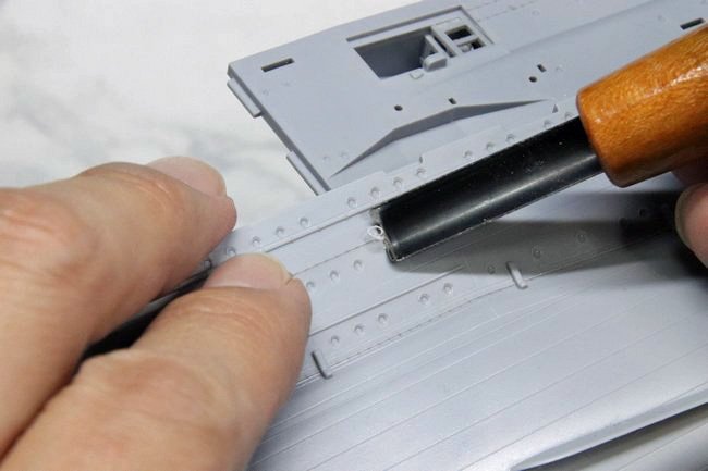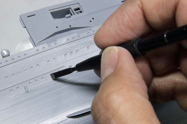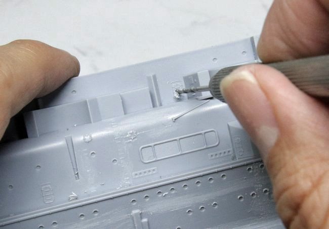 続いては水密扉の処理です。扉のモールドは、削り落とす前に軽くドリルで中央に穴を開けておけば、位置の確認がしやすくなることに加えて、接着剤を付けた時の「逃げ」にもなり、はみ出しを防ぐ効果があります。