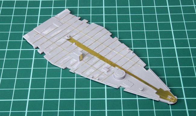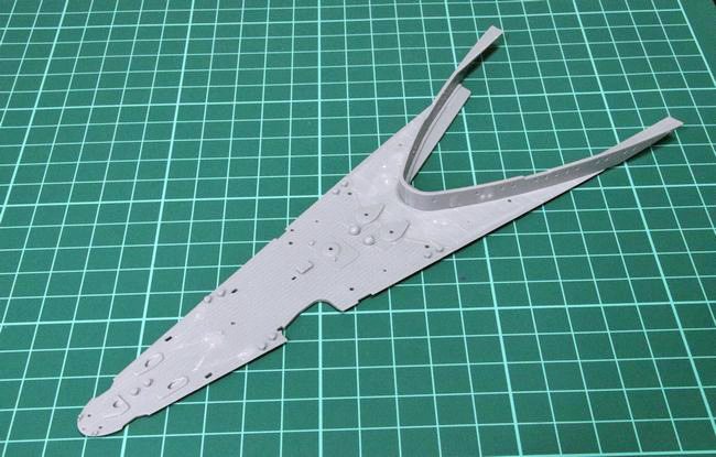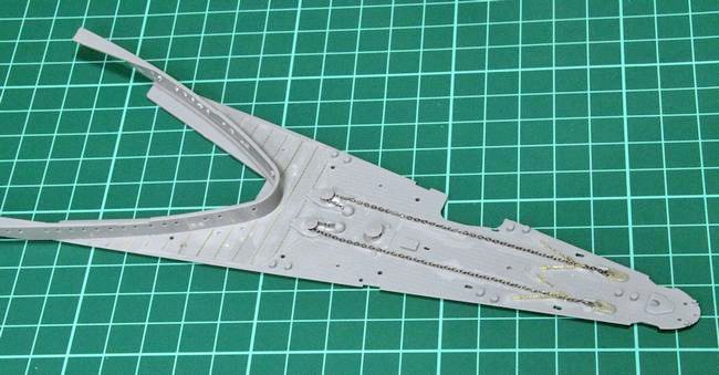 艦首のディテールアップも同様に進めました。艦尾と比較して、艦首の錨鎖甲板周りは、ディテールアップパーツ使用に備えた取り付け穴の処理が少し多めです。まずは艦尾と同様にリノリウム押さえ金具のモールドを全て削り――