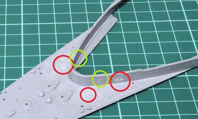 そのあと、不要な取り付け穴を埋めました。赤丸部分は、ディテールアップパーツ(ホーサーリール、パラベーン)取り付けに備えて穴を埋めた箇所。緑の部分は、水密扉の取り付けに備えてモールドを切削した箇所です。取り付け穴は、予めドリルで1.1mm径に拡張したのち、1mm径のプラ丸棒を差しこんで流し込みセメントで溶着し、硬化後にサンディングする要領で済ませました。