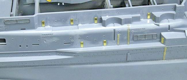 今回から、ようやく船体への本格的なパーツ取り付けとディテールアップに進みます。まずは、予め削り落とした扉とラッタル、ルーバーなどのモールドをエッチングに置き換え、取り付けダボなどを削った状態からのスタートです。