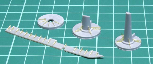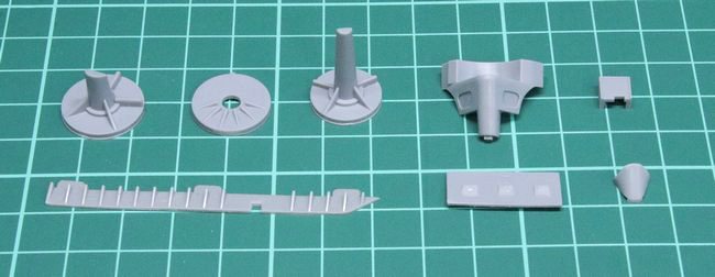 高角砲周りのスポンソンと外部通路、起倒式マストの取り付けブラケットなどのキットパーツ。この時点で、一部の取り付け穴埋めなどを既に済ませました。