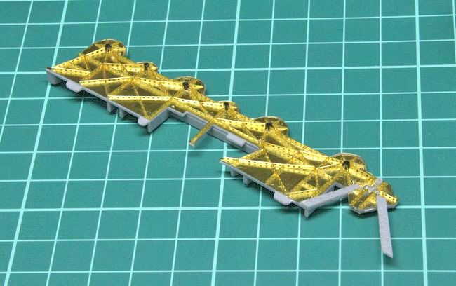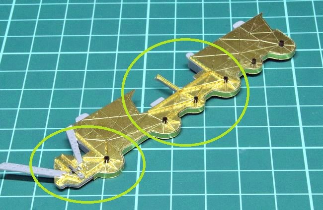 補強材は端から順番にやるのではなく、まずは中央を先に済ませ、続いて外側からと取り付けていきました。機銃座下部の黒いパーツは3Dプリントパーツで、シップヤードワークスのパーツセットに付属しているものです。