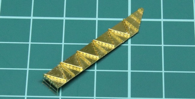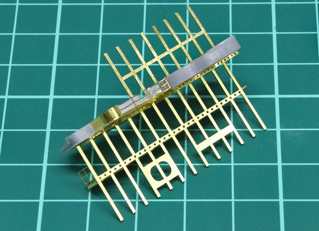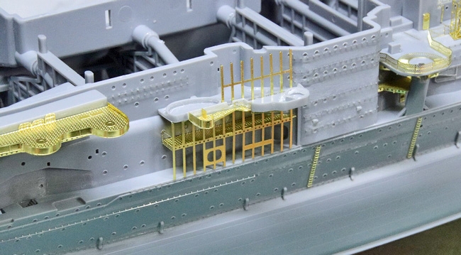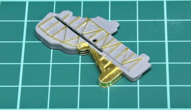 中段の張り出しにはキットは使わず、フルエッチングのパーツに置き換えました。この写真には写っていませんが、表側にも細かい滑り止めパターンが入り、プラパーツと比較して、数段繊細な仕上がりです。