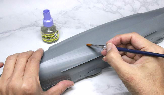合わせ目にも、流し込みセメントを流して圧着させました。私はこうした処理には、GSIクレオスの「Mr.セメントSP」を使用し、市販の幅広の筆で多めに流しています。