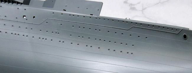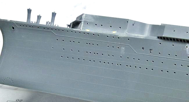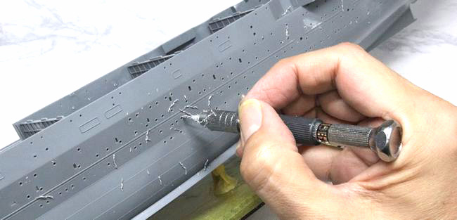 船体の下処理として、舷窓の開口をおこないます。キットの舷窓は、ままでは少し浅く、メリハリが不足しているので――、