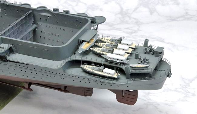 船体の塗装が完了したタイミングで、短艇甲板への艦載艇設置と手摺&ラッタルのとりつけも済ませました。狭いデッキに無数の小型艇が並ぶ様子は、非常に見応えがあります。