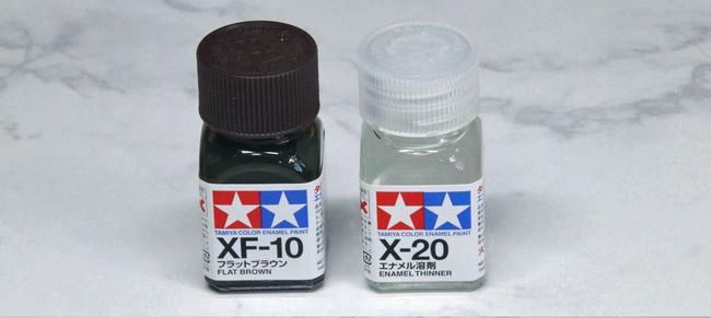 ウォッシングには、定番のタミヤのエナメル塗料を使用しました。ここではXF-10「フラットブラウン」をX-20「エナメル溶剤」で薄めに溶いていますが、スミ入れ塗料を使っても同じ効果が得られます。