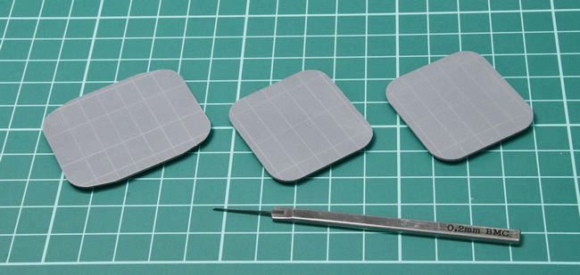 今回は飛行甲板塗装の後編です。木甲板部の塗り分けが終わった段階でエレベーターの取り付けをするのですが、塗装前に軽く表面にパネルラインを入れ、ディテールの密度をアップさせました。使用した工具は、スジボリ堂のBMCタガネ0.2mmです。