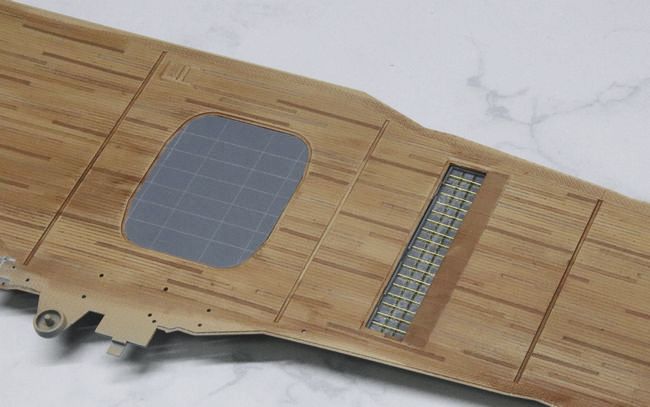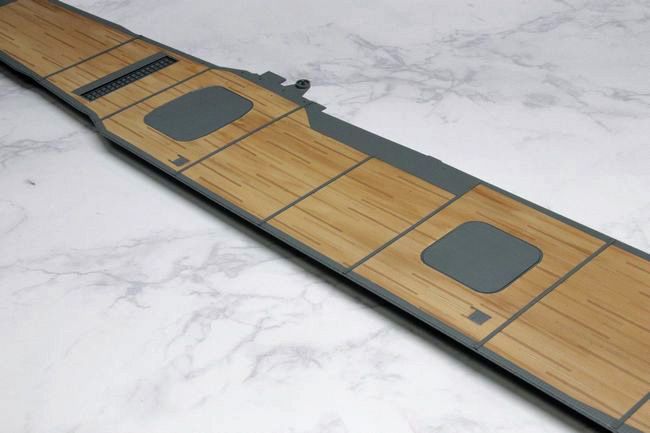 木甲板色を塗った後に、木甲板部用のシートを貼った様子。伸縮接手の部分が開いてますが、今回はプラ板で自作するため、6mm幅のテープで塞ぎました。