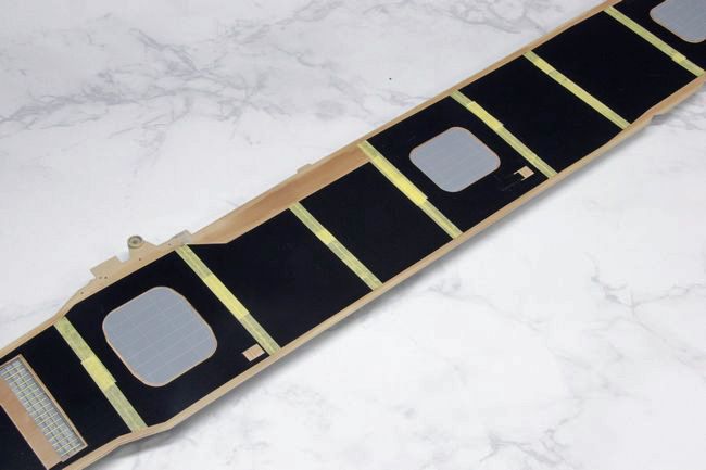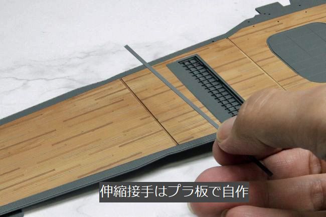 プラ材による伸縮接手の取り付けが完了した様子。これで、甲板表面が数段、平坦に仕上がりました。
