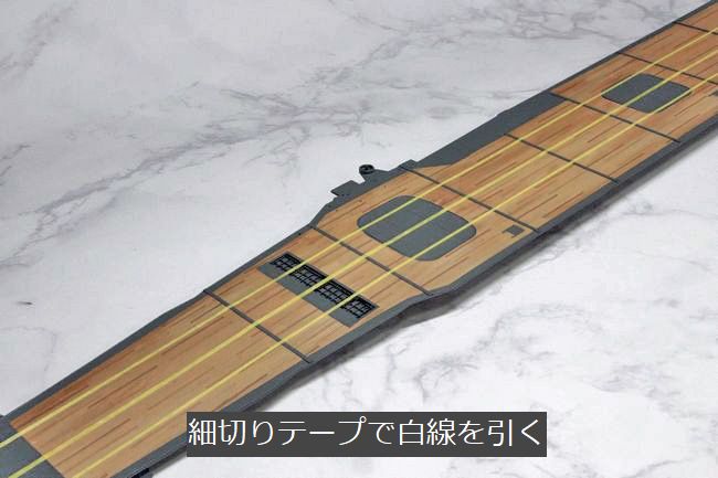 最後に、高角砲位置の警戒線と、艦載機の発艦限界線(?)、艦尾の着艦表示の紅白ラインを引きました。これらのマスキング用シートは、モデルファクトリーハイギヤードの1/350航空母艦「翔鶴」専用マスキングシートにも付属しています。
