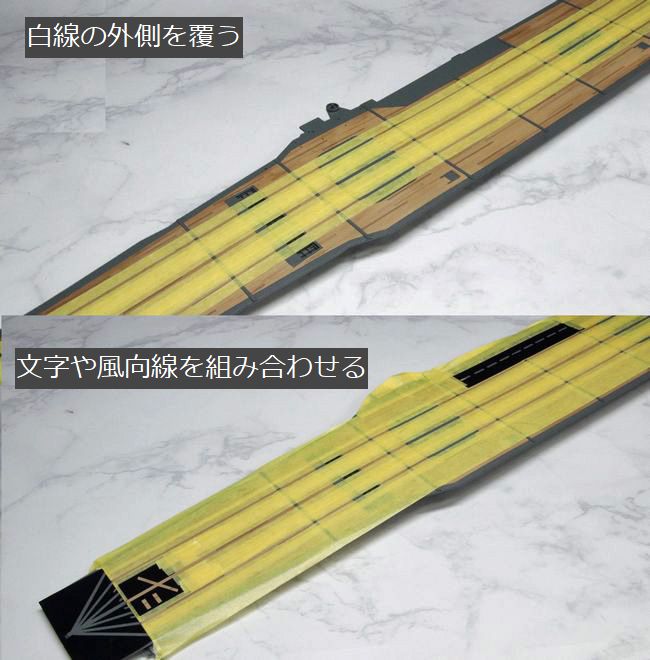 テープで引いたラインの外側を覆うようにマスキング。基準となるラインのテープを剥がしたのち、破線と艦名表示、風向線などのシートを割り込ませました。
