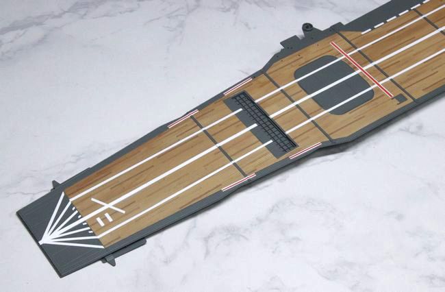 塗り分けを終えた飛行甲板の全景。制動策や遮風索がまだついていないので、多少間延びしている印象ですが、これで飛行甲板の基本塗装が完了しました。