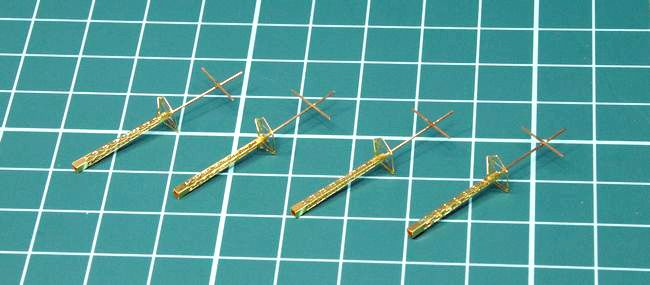 本日は船体の最終仕上げとして、細々とした装備品の製作と取り付けをご紹介します。まずは起倒式マストですが、純正パーツではマストトップにプラパーツを使う指定になっていたので、0.4mm径の真鍮線で自作しました。