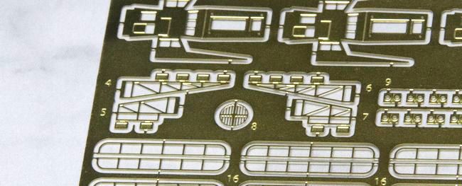 写真中央のパーツは、着艦指導灯(と探照灯レンズのシャッター)です。このエッチングはフジミのデラックス版キットには付属していないので、姉妹艦の「瑞鶴」用パーツセットのものを使用しました。