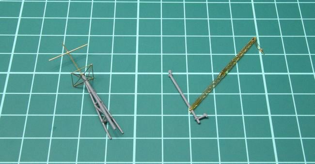 メインマストも部分的に真鍮線に切り替え、同時に飛行甲板上のクレーンも(キットパーツ+純正エッチングにて)仕上げました。
