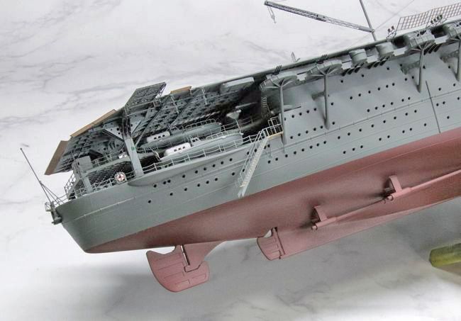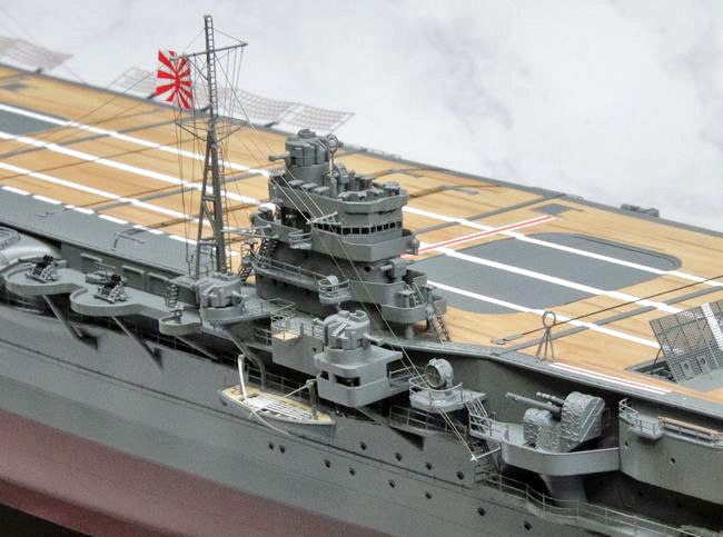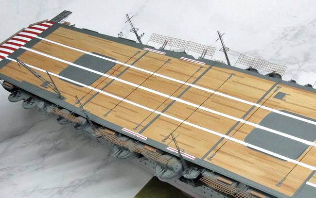 マストと着艦指導灯に加え、飛行甲板両脇の飛行機救助網と、艦首尾の人員救助網も取り付けも完了し、飛行甲板周りのディテールが整いました。