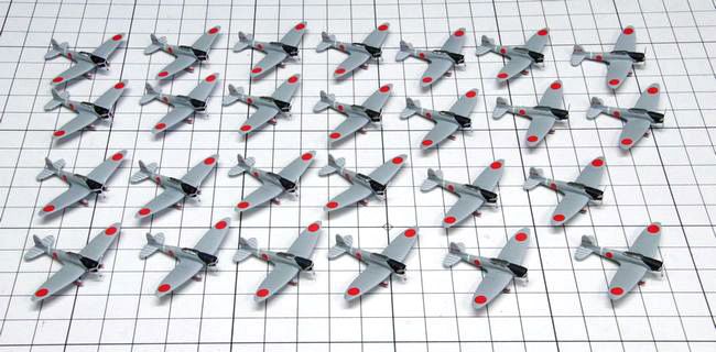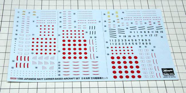 艦載機の基本塗装が終わったら、次はデカール貼りです。これはハセガワパーツに付属のデカールシート全景ですが、このシートには基本的に赤城の所属機用のデカールしか含まれておらず、フジミキットのデカールは零戦、艦爆、艦攻用が各3機ぶんしか付属していないので、このままでは翔鶴所属機×35機の再現は不可能です。