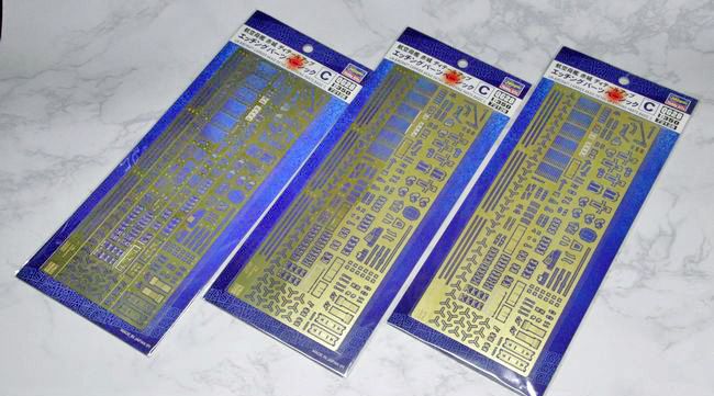 ディテールアップ箇所は主にプロペラですが、これはハセガワの艦載機セットには付属していないので、ハセガワ純正のディテールアップエッチングパーツのCセットを導入しました。これも、1枚につき艦爆用デカールは10枚しか含まれていないので、計3セットを投入しています。