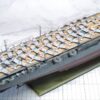 続いては左舷艦首周りの様子。飛行甲板は仕上がりのイメージを大きく左右するので、木甲板の板目の色調の差異を4色の塗料を使い分け、更にエナメル塗料のブラウンを薄めに溶いたものを軽く重ねて深みを演出しました。また、キットで省略されている伸縮接手をプラ板で自作し、タガネでエレベーターのパネルラインを入れるなど、間延び防止の処置を施しています。