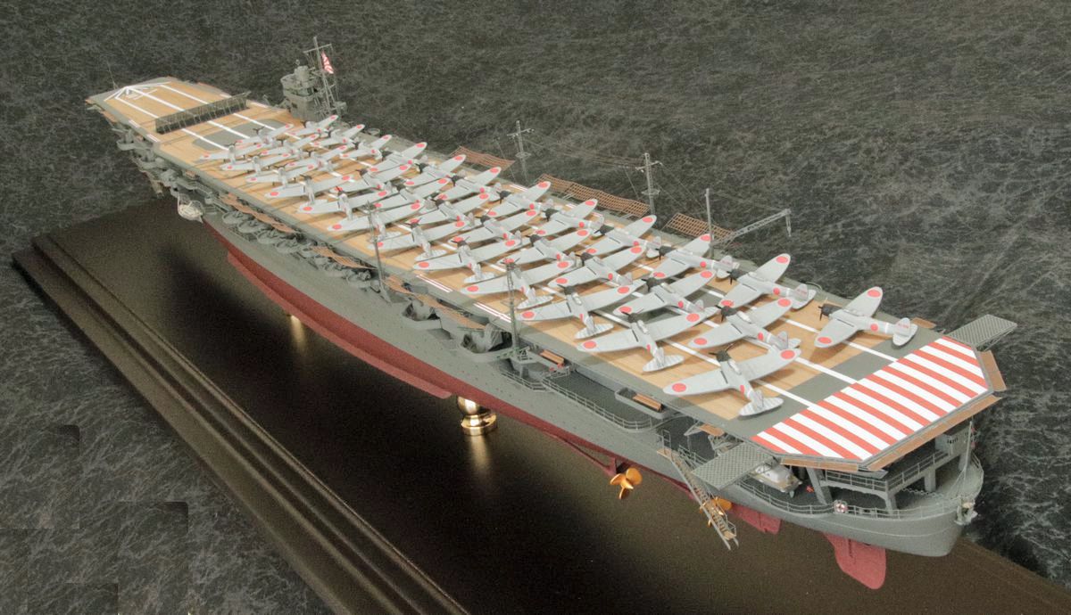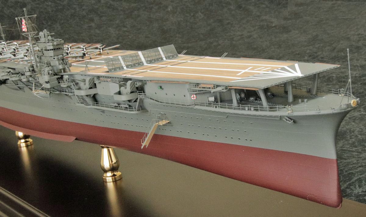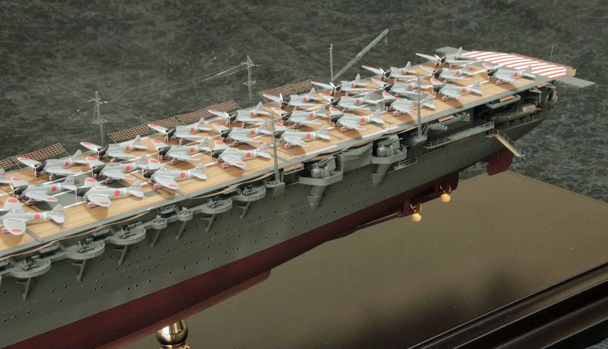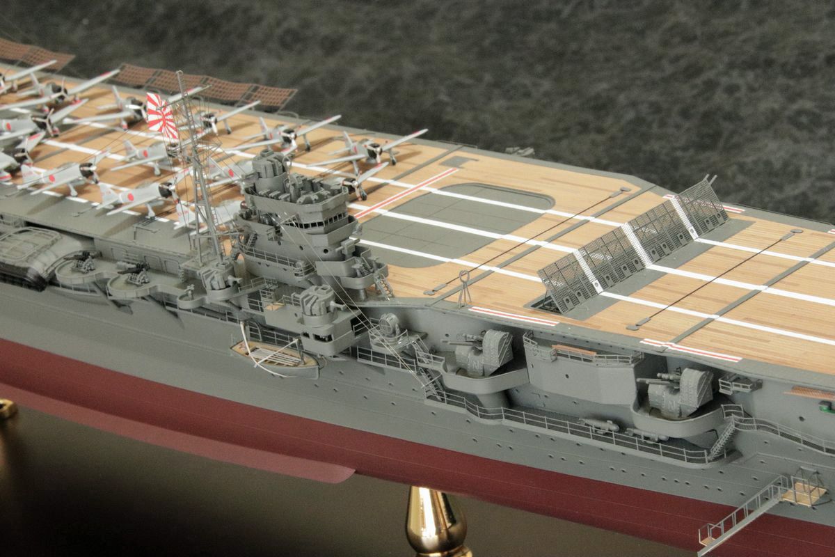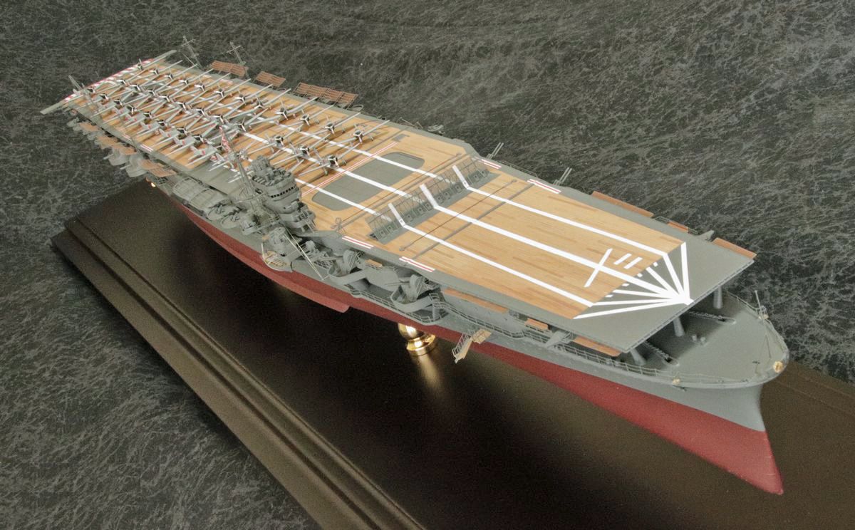 艦載機満載状態の大型正規空母は迫力満点! 木甲板の板目の色調再表現も、違和感がない程度に綺麗にまとまってくれました。来年にかけては、1/350航空母艦「赤城」の製作予定が2隻、控えておりますので、日本海軍航空母艦のファンの皆さまには、引き続き当ブログにご注目いただけましたら幸いです。