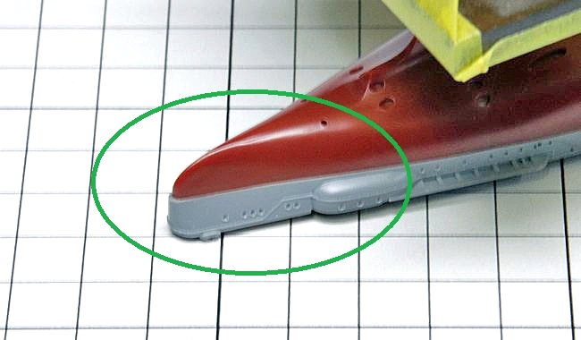 艦首周りをサンディングしている様子。段付きの小さな箇所に限っては、これだけでも、ある程度は目立たなくさせることもできますが――、