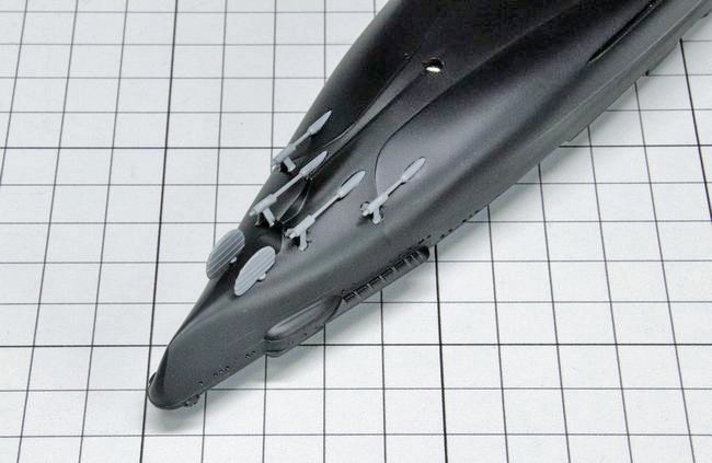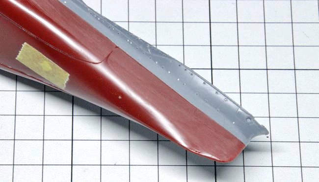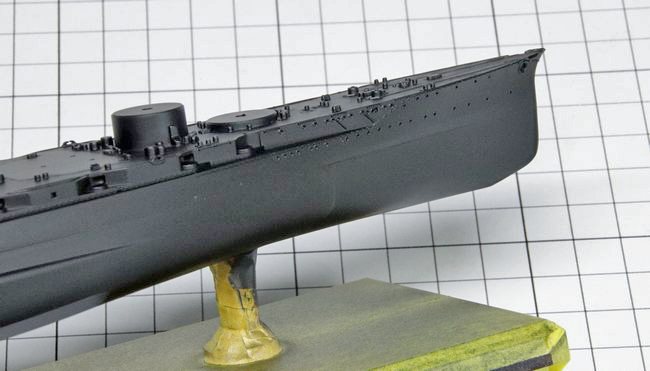 黒サフを吹いてみると、僅かにスジが残ってしますので、側面や艦尾の段差と共にパテ埋めをおこないます。