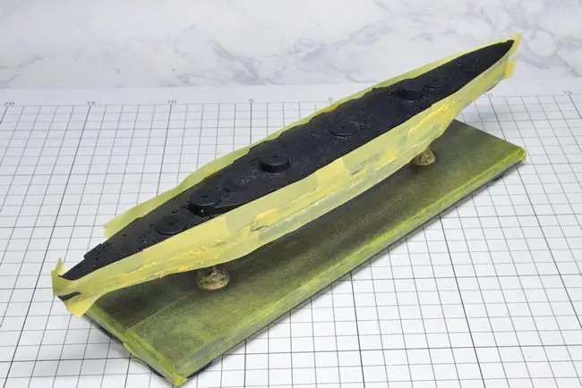 使用したのは、タミヤのポリパテです。作業前には舷側と船底をマスキングテープで覆い、不要な箇所にパテが付かないように保護しました。