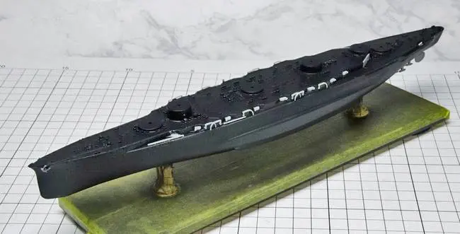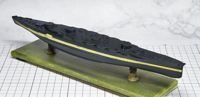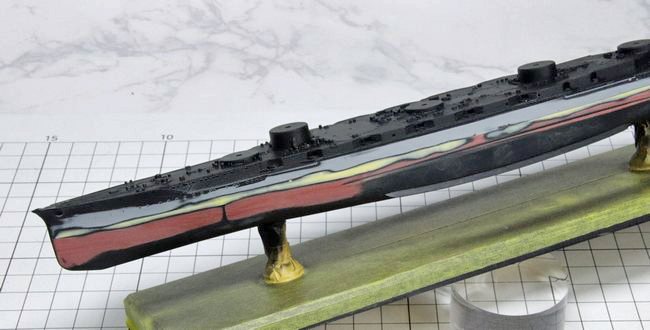 今回は船体の下地処理をご紹介します。1/700のフルハルモデルでは生じがちな問題なのですが、フジミの扶桑も船体上下の合いはあまり良い方はなく、全長や全幅に差があることから目立つ段差が出来てしまうので、塗装前に徹底的に修正しました。
