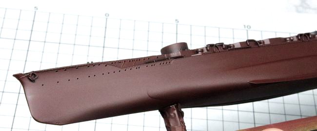 前回までに船体の合わせ目処理が完了したので、まずは船底から塗装を始めます。まずは下地として、軽くガイアノーツの「サーフェイサーエヴォ オキサイドレッド」を吹き、上塗りにMr.カラー29「艦底色」を重ねました。