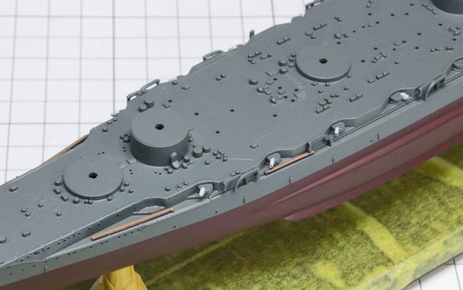 リノリウム甲板部には、Mr.カラー606「リノリウム色」を使用しました。写真では確認しづらいですが、押さえ金具の部分は塗膜を削り、地金を露出させることで真鍮金具のイメージを表現しています。