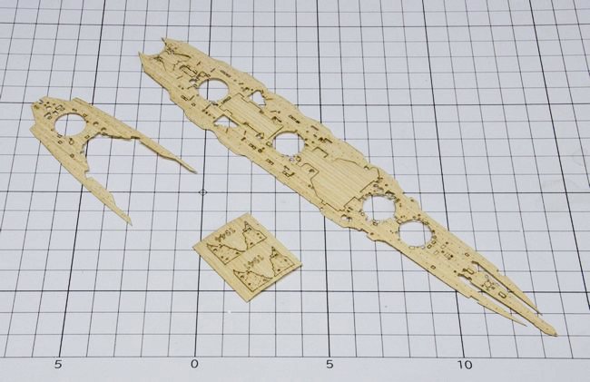 続いては木製甲板の取り付けです。フジミの木製甲板は1941年時と1944年時の両方に対応しており、艦橋基部には2種類が用意されています。
