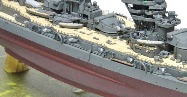 最上甲板外周部の手摺りは、フジミの純正エッチングパーツを切り離し前に塗装しておき、切り出し後に接着――、ゲート部をのちほどタッチアップする手順で仕上げました。