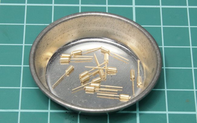 予め、組み立てと塗り分けを終えておいた対空兵装と探照灯を取り付け。最後に艶消しクリアーでコーティングをおこなうため、探照灯のレンズ部のマスキング(ゾル)は、剥がさずに残しています。