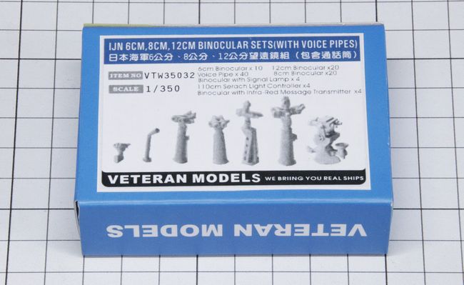 今回は光学機器類と、艦橋周りに取り付けるパーツ群をご紹介します。まずはバンカースタジオの15m&10m測距儀と主砲射撃指揮所のセットで、エッチングでは自然な表現が難しい、上部の花びら型に開いた手摺りや航海灯の支柱形状が実感的に表現されています。