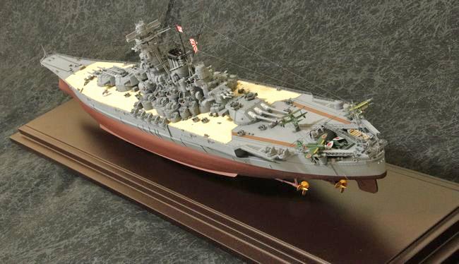 ディスプレイケースには、タミヤ純正品を使用します。このケース、もともとはマスターワークコレクションの完成品用のものでしたが、2005年の「男たちの大和」が上映された頃あたりからバラ売りが開始され、現在も販売を継続してくれている、大変ありがたい製品です。飾り脚用の穴開けもやりやすいように、裏側にザグリが設けられるなどのリテイクも重ねられており、タミヤらしいユーザビリティを感じる逸品です。