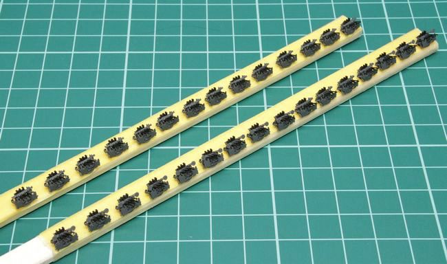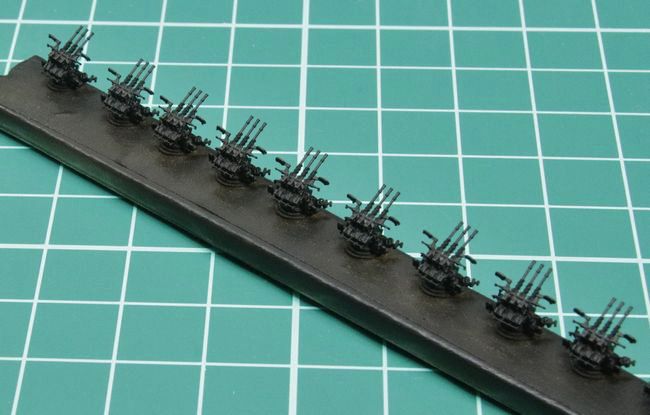 予備も含めて、計30基の三連装機銃が揃いました。数が多いとサポートの処理や塗り分けもそれだけ手間がかかりますが、丁寧な作業を心がけた甲斐あって、仕上がりが綺麗に揃ってくれました。