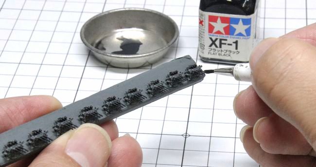 エデュアルドの機銃は銃座と銃身が一体ですので、銃身の塗りわけは筆塗り以外に方法がありません。今回はタミヤのエナメル塗料のXF-1「フラットブラック」を使用しました。
