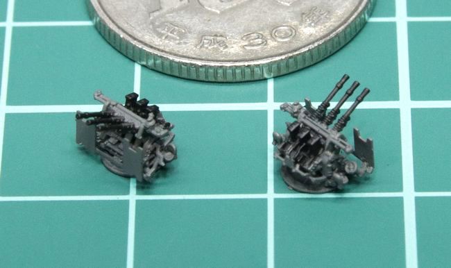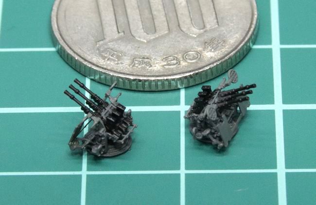 その一方、防盾が付属していないのは少々もったいない点で、同社の連装機銃にはエッチング防盾が付属しているのに、なぜ三連装には付属していないのか? 少し気になりました。(←逆なら分かるのですが)